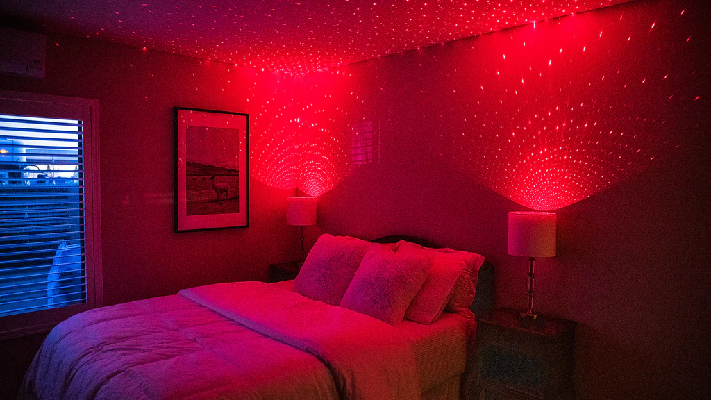 Mỗi căn phòng đều có điểm nhấn riêng: bồn tắm rộng, gương trần phản chiếu ánh sáng, chăn ga satin mềm mượt, và hệ thống chiếu phim riêng tư – tạo nên không gian vừa sang, vừa “cháy”.